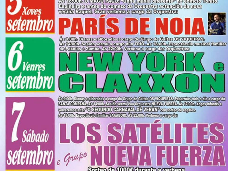 Buena comida, pero también buena música. Están previstas varias actuaciones de música y baile a cargo de las siguientes agrupaciones: Banda de Gaitas Ferreñas de Vilarmaior, AFC Orballo (Pontedeume), Asociación Cultural "Pandereteiras Ardevento" y Grupo Baile "O Rueiro" de Tabeaio. La fiesta da el pistoletazo de salida a las fiestas de la Virgen del Socorro de Carral. Aquí puedes ver el programa de fiestas que incluye como colofón este jueves a la orquesta París de Noia