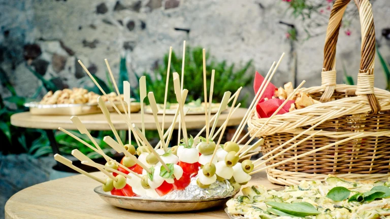 Sobre la mesa, una bandeja cuadrada con varios pinchos. Una brocheta, croquetas, mini hamburguesas, churros, croissants o algo de fiambre y queso. Primera advertencia: por mucho que lo hayas visto antes, en cuanto los ojos se tapan, parece que se mueve todo de sitio. Es importante palpar el plato para ‘ver’ los límites y hacer una composición mental del espacio disponible.