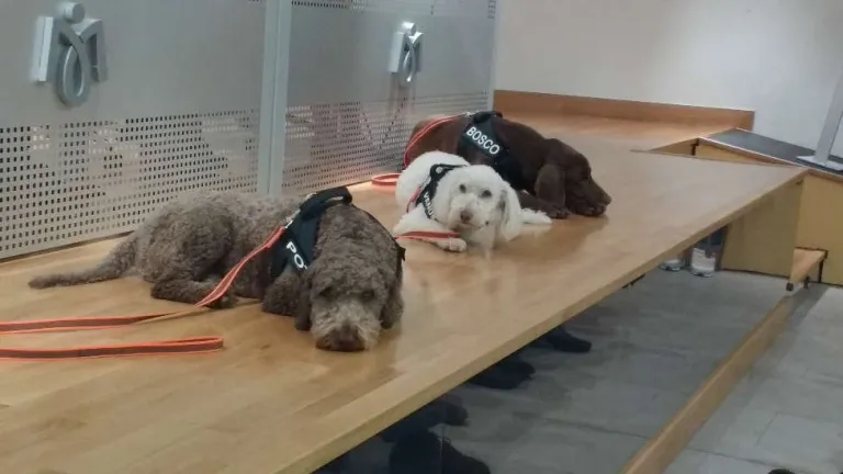 Pot lleva menos tiempo. Tiene año y medio y el adiestrador está más pendiente de él. Es igual de bueno que el resto y lo vemos ladear la cabeza. Nos cuentan que este perro de aguas gris no ve de un ojo, y tiene problemas de equilibrio. Pot es también un ejemplo de que la disapacidad no supone ninguna limitación, y de cómo adaptarse (a través del olfato, de las indicaciones...) y superar las frustraciones.