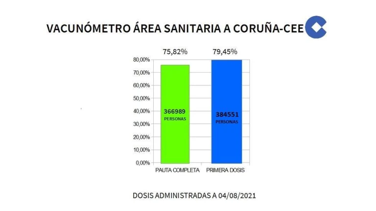 El 75,82% de la población mayor de 16 años del área sanitaria A Coruña-Cee tiene la pauta completa de vacuna contra el coronavirus. Con datos del 4 de agosto, se ha llegado a 366.989 personas. La mayoría, el 73%, tiene las dos dosis de Pfizer.