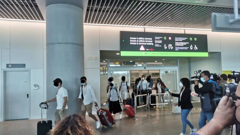 Llegada de estudiantes procedentes de Mallorca al aeropuerto compostelano de Lavacolla. - EUROPA PRESS