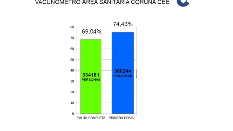 El SERGAS ha completado la vacunación de coronavirus al 69,04% de la población objetivo en el área sanitaria A Coruña-Cee, la que es mayor de 16 años. 334.181 personas han recibido la pauta completa de inmunización, 13.664 en la última semana.