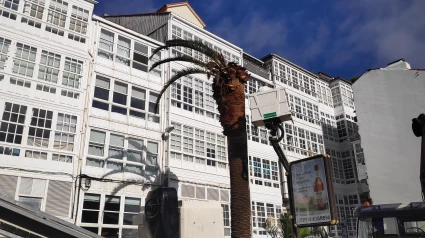 Este lunes el centro de A Coruña se queda sin un árbol veterano. Tal y como estaba anunciado, han talado la única palmera que había en la avenida de La Marina, situada a la altura del Callejón de la Estacada.
