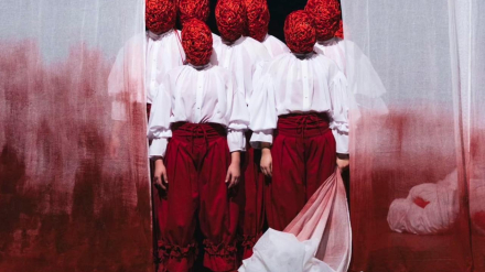 Lo más llamativo del espectáculo es la fusión de la danza tradicional y contemporánea y la puesta en escena con las caras de los bailarines cubiertas de hilos rojos