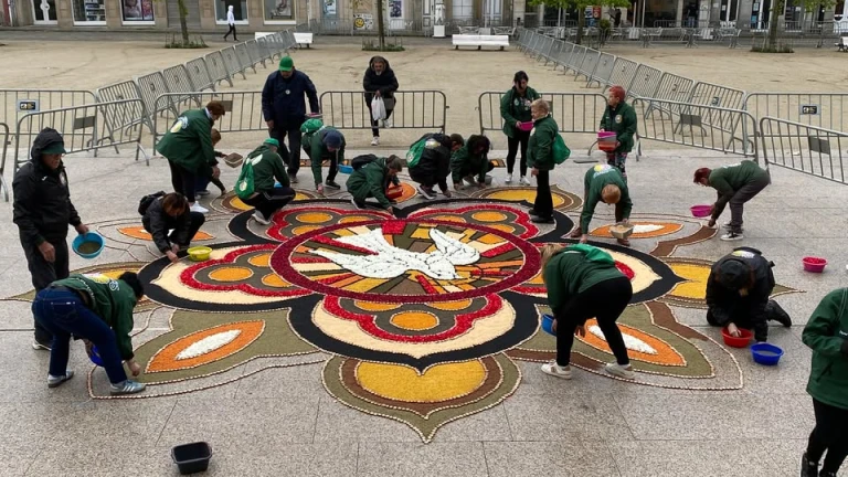 Invitados por la Junta de Cofradías y Hermandades de Semana Santa y el Ayuntamiento de Ferrol, la Asociación de Alfombristas Do Corpus Christi de Ponteareas confeccionaron en la mañana de este domingo, Domingo de Resurrección, una alfombra floral en la plaza de Armas, que finalmente no pudo recibir a los cofrades, tras suspenderse la procesión del Gozoso Encuentro y la Procesión de la Resurrección por las lluvias.