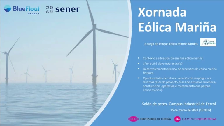 El Salón de Actos Concepción Arenal del Campus Industrial de Ferrol acogerá, el próximo miércoles 15 de marzo, de 16:00 a 17:00 horas, la Jornada Eólica Marina a cargo del Parque Eólico Noreste impartida por Helena Brage, Business Development Manager de la empresa Blue Float.