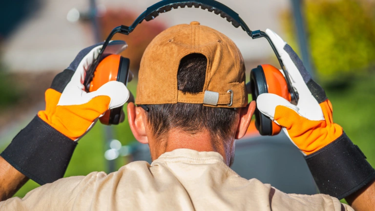 Un operario se pone protección auditiva para realizar trabajos en el exterior