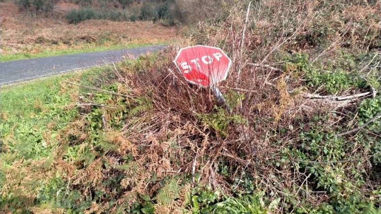 Un señal de Stop en el medio de la maleza en la carretera de Esmelle a Covas - FOTO: PP de Ferrol