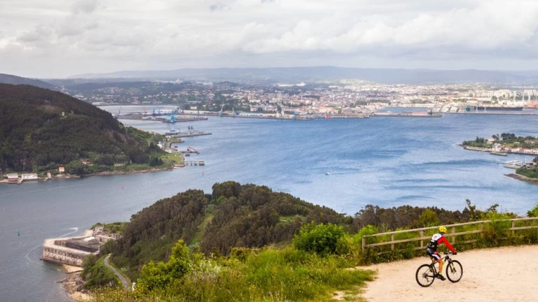 Un ciclista en primer plano y la ría y ciudad de Ferrol al fondo - FOTO: Correos
