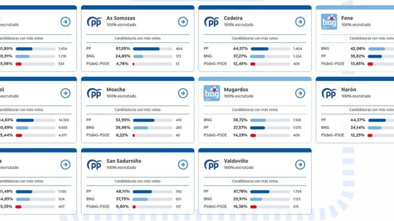 En Narón, el PP también es la fuerza más votada al lograr 8.157 (44%) de los votos, por los 6.276 (34%) del BNG y los 2.253 (12%) del PSOE.