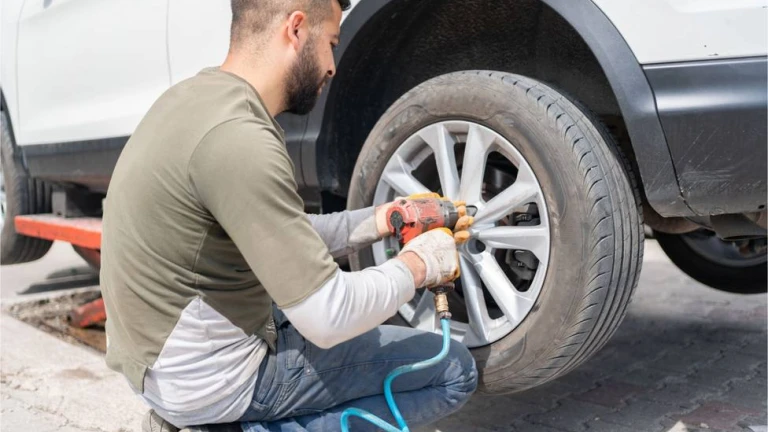Un mecánico saca una rueda de un vehículo por su mal estado