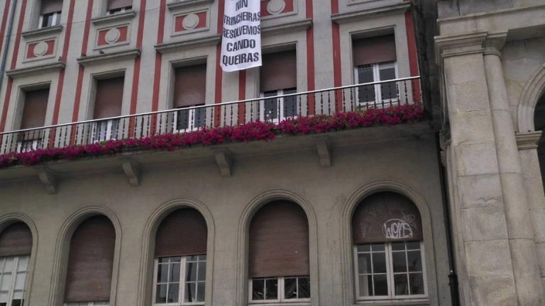 Pancarta que habían colocado los trabajadores del concello y que fue retirada por los bomberos