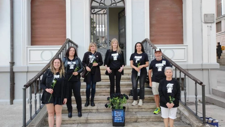 Los trabajadores de la Biblioteca de la plaza de España antes de entrar el pleno con las rosas negras