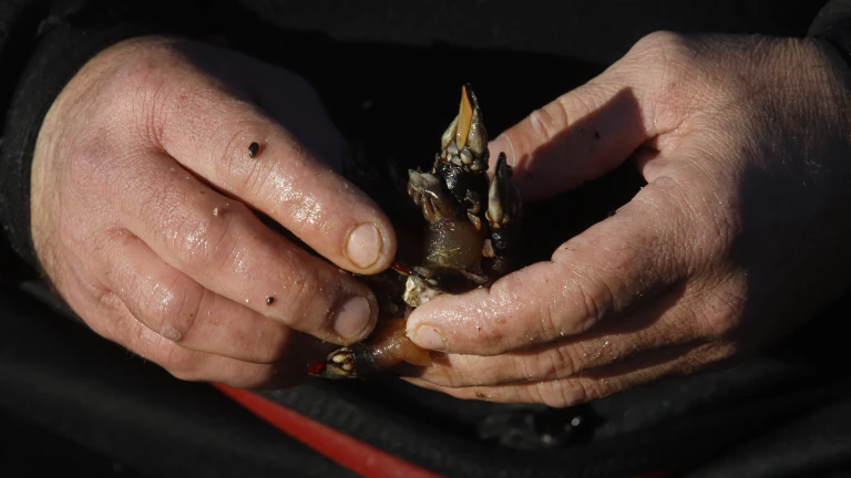 Foto de archivo de una persona limpiando un percebe tras su captura