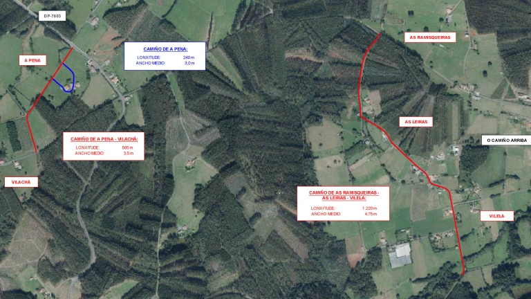 Uno de los proyectos se ubica en el lugar de A Pena, en Santa Mariña do Monte. Se trata de un camino asfaltado de 505 metros que conecta la carretera provincial DP-7603 con Vilachá, incluyendo un tramo circular adicional de 240 metros que da servicio a dos viviendas.