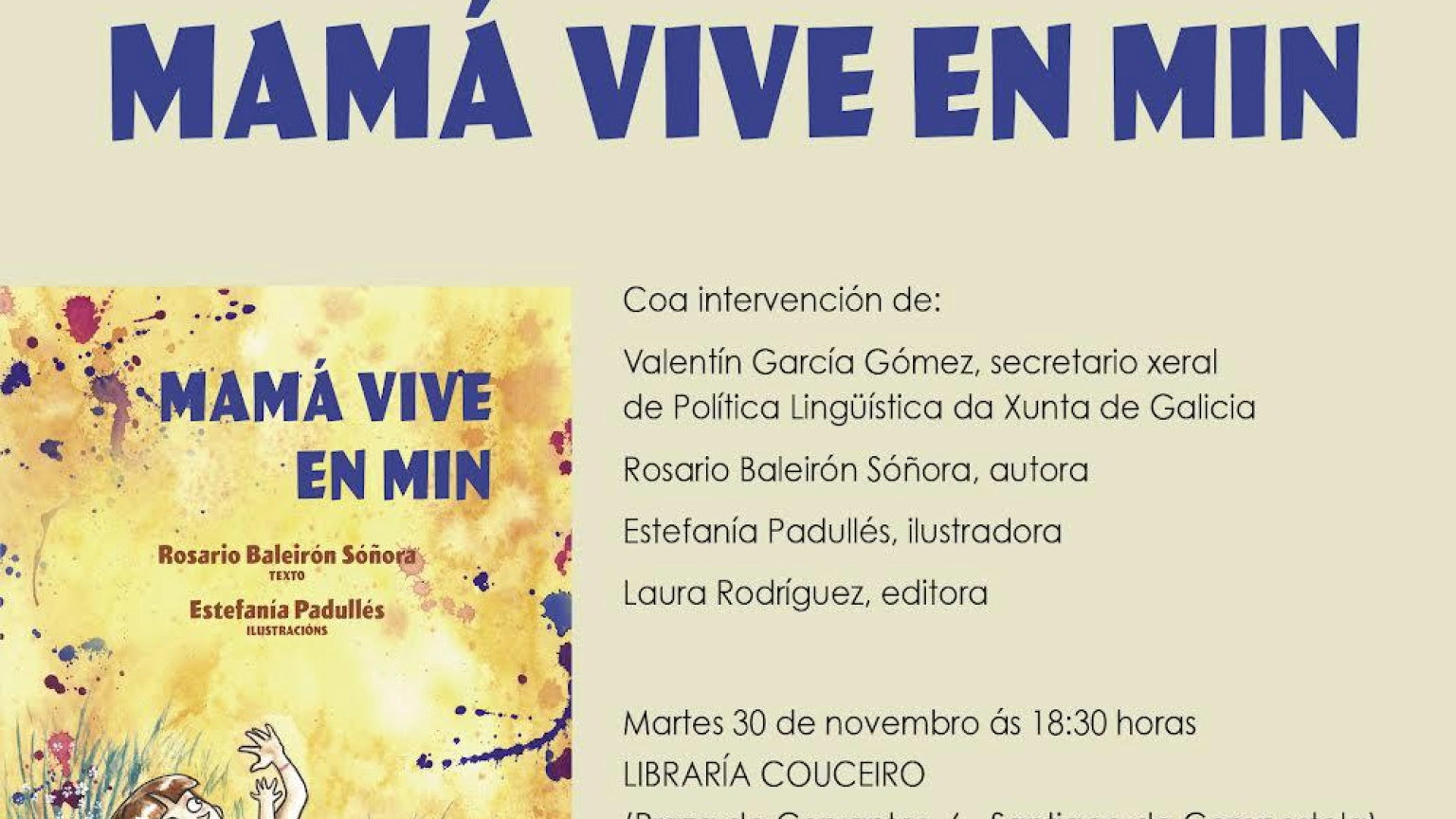 Última hora de la actualidad en Santigo, con entrevista a Charo Baleirón: esta tarde presenta en la Librería Couceiro su primer libro infantil, "Mamá vive en min", un homenaje a su cuñada fallecida y a la vez, un regalo para sus sobrinos.