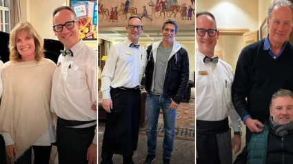 Javier se toma fotos con los rostros conocidos que pasan por el hotel donde trabaja en Santiago