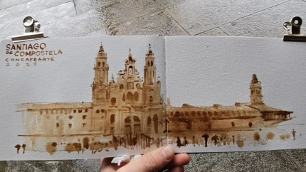 ¿Pintar con café? A este artista no se le resiste ni la Catedral de Santiago