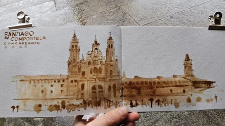 ¿Pintar con café? A este artista no se le resiste ni la Catedral de Santiago