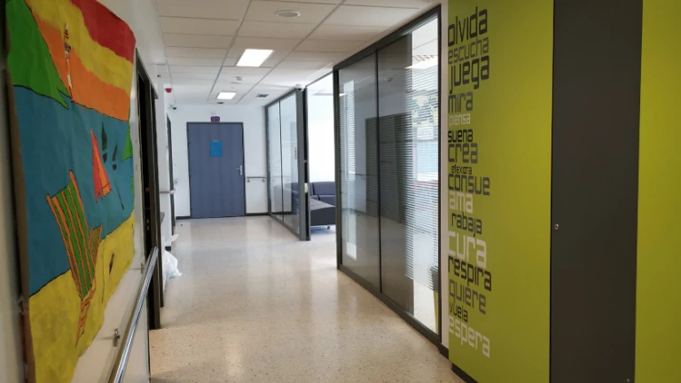 En la unidad de hospitalización, además de las propias habitaciones, hay un espacio común utilizado para comedor y actividades, una sala de reflexión y una sala de espera para las visitas familiares. Fuera, disponen de un parque del hospital y una escuela para continuar con la formación académica.