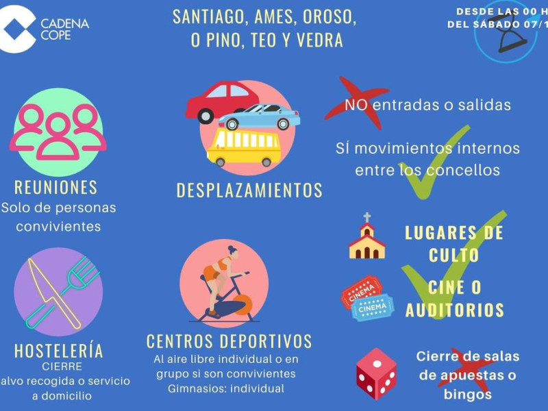 En el resto de ayuntamientos de la comarca compostelana, la vida seguirá igual. No obstante, ya no habrá desplazamientos permitidos a los tres municipios que salen de la lista.