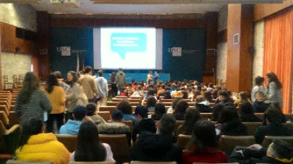 Diez años cumplen los ENCONTROS NA ZONA USC, en los que la Universidad de Santiago invita a los centros de secundaria de toda Galicia a conocer su oferta educativa. La acogida ha ido a más casi en cada edición: esta semana reciben a unos 3.500 estudiantes. Este miércoles desembarcaron futuros periodistas, economistas, enfermeras, médicos, matemáticos... procedentes de Monterroso, Pontevedra, Vilagarcía o Ferrol. Todos, estudiantes de Bachillerato: algunos con la idea clara sobre por dónde encarrilar su formación, otros todavía bastante despistados: "hace dos años estuve tentada a hacer Derecho", nos decía una estudiante pontevedresa que ahora aspira a entrar en Magisterio. En otros casos, pesa la tradición familiar: "mi madre quería estudiar enfermería, por desgracia no pudo, ahora hace sustituciones en el Hospital del Salnés como auxiliar y para mi es un ejemplo", comentaba otra joven.