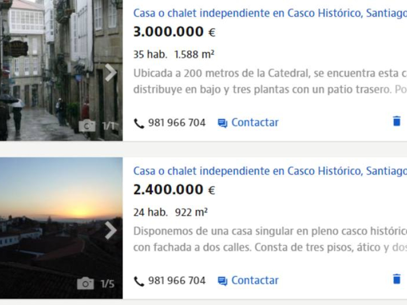 En Idealista, sin embargo, los dos inmuebles más caros en venta en la capital de Galicia se encuentran en la zona histórica. Por el más caro piden 3 millones de euros, pero según el anuncio en la web es un inmueble de 3 pisos a solo 200 metros de la Catedral y con posibilidades de albergar un hotel.