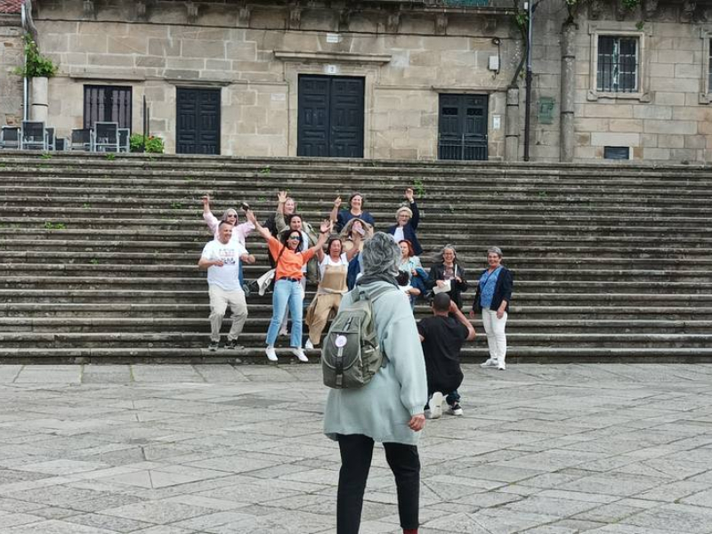 En la Alameda, esperando por el coche de alquiler que los llevará a Fisterra, encuentro a siete peregrinos franceses. La de hoy es jornada de descanso relativo tras la aventura que acaban de completar. Marie Claude me cuenta que iniciaron la peregrinación en 2016 en Estrasburgo. Ella y sus amigos son muy andarines y decidieron poner rumbo a ese destino que es tan popular en toda Francia: planificaron aprovechar todos los años entre quince y veinte días de vacaciones para ir acercándose a Santiago pero llegó el covid y los planes quedaron en suspenso. Solo dos años.