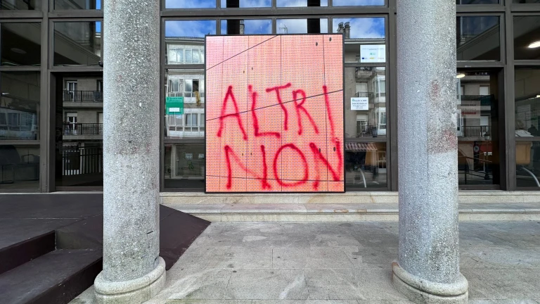 No fue nada buena la desagradable sorpresa que este martes tuvieron quienes se acercaron a primera hora de la mañana al Concello de Ames y que comprobaron cómo, aprovechando la noche, alguien había realizado una pintada con spray en contra del proyecto de Altri en Palas de Rei. Aunque, a diferencia de otras muchas que en los últimos meses proliferan por muros, paredes y hasta señales de tráfico de distintas ciudades y pueblos de Galicia, en este caso los autores la habían realizado sobre una pantalla led situada a la entrada del Consistorio, lo que la ha inutilizado provocando unos daños valorados en 5.000 euros.
