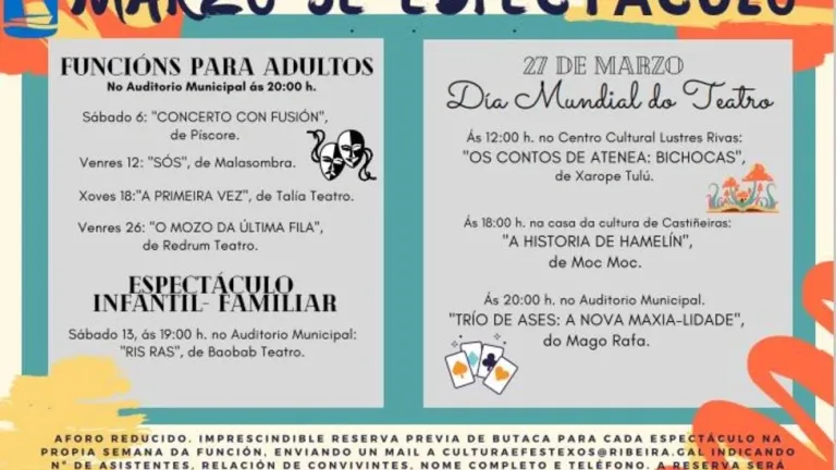En todo caso, desde Ribeira se apuesta por retomar viejos y saludables hábitos como el poder disfrutar de una buena obra de teatro o ir en familia a gozar de los cuentacuentos o de la magia. Y para ello se han programado ocho citas, todas ellas gratuitas, que a partir de este próximo sábado, 6 de marzo, van a tener lugar en el Auditorio Municipal o en el centro cultural Lustres Rivas y en la Casa da Cultura de Castiñeiras.