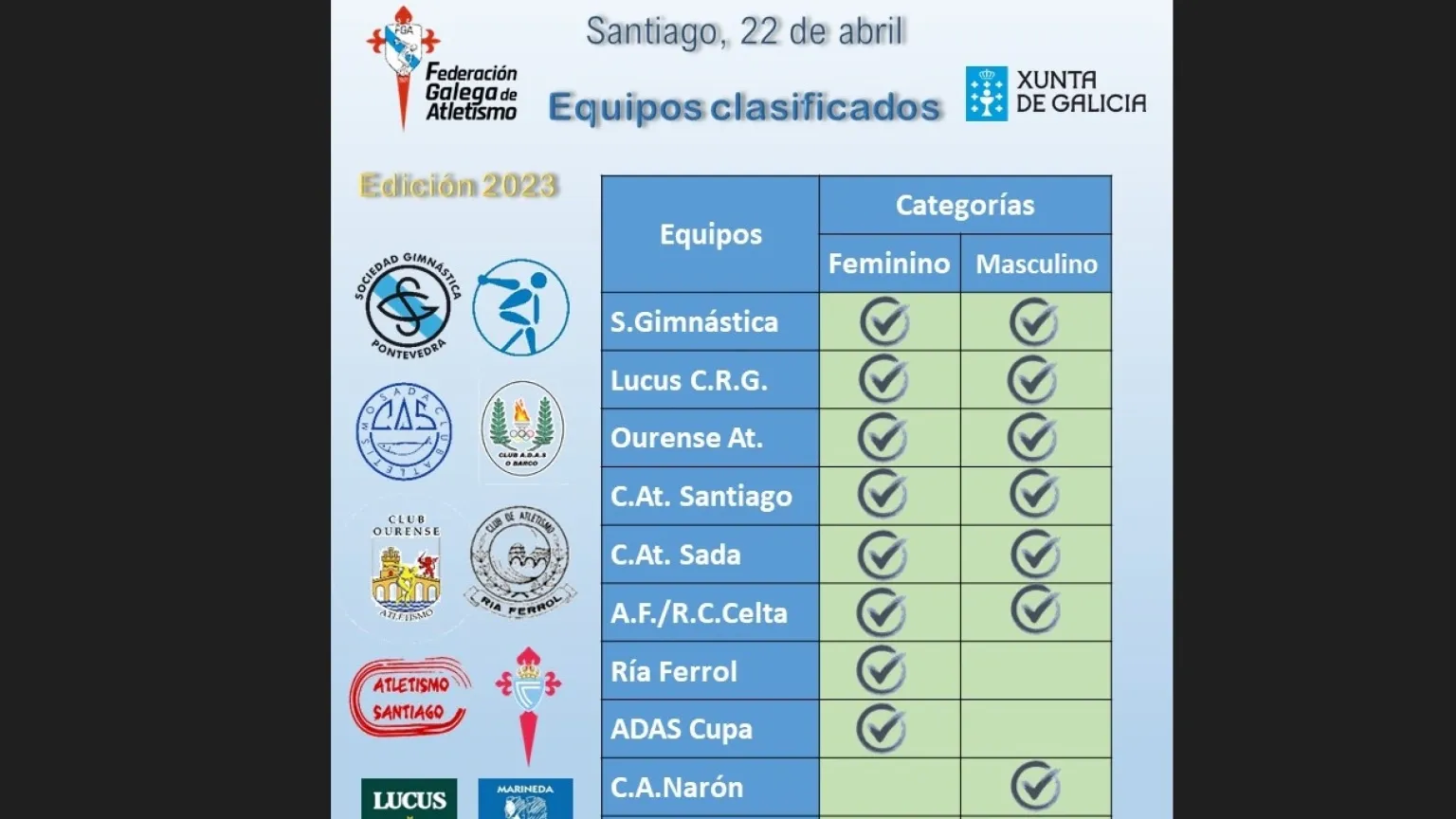 Acompañarán aos pontevedreses as formacións do Celta Atletismo, Atletismo Santiago, Atletismo Narón, Lucus Caixa Rural, Atletismo Sada, Ourense Atletismo e Marineda Atlético. Na categoría femenina serán os clubs de Ría Ferrol, Atletismo Femenino Celta, Atletismo Santiago, Atletismo Sada, Lucus Caixa Rural, Ourense Atletismo e ADAS CUPA quenes disputen as gimnásticas o título.