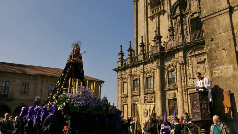 La programación de la Semana Santa de Santiago daría comienzo este viernes, 3 de abril, con la salida de su primera procesión: la de la Virgen de los Dolores. Son un total de 17 desfiles procesionales los que estaban programados en la capital gallega hasta el Domingo de Resurrección. Además, en Santiago de Compostela, es muy tradicional también la procesión Dominica in Albis, del barrio compostelano de Conxo: el domingo 19 tendría lugar la tradicional procesión que traslada al Cristo de la Paciencia desde la Catedral de Santiago hasta la Iglesia de la Mercé.