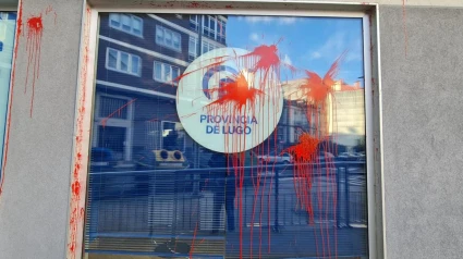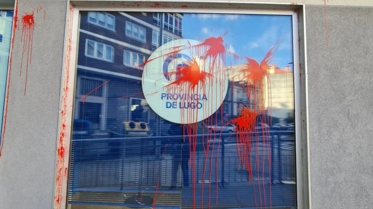 La fachada de la sede del PP de Lugo apareció manchada con pintura roja y carteles propalestina