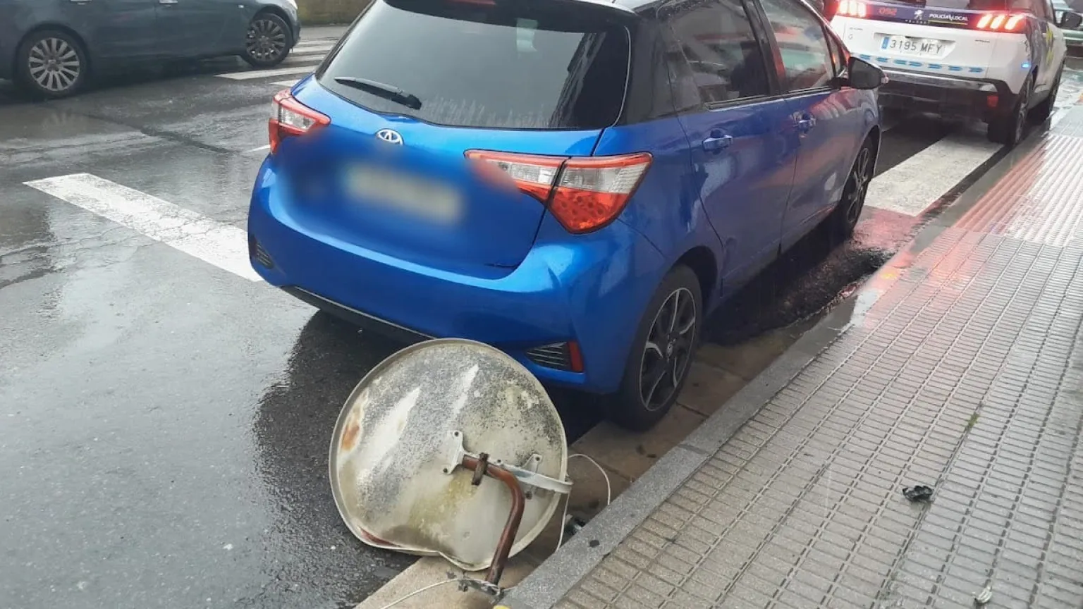 Una patrulla de la Unidade Territorial de Policía de Barrio se trasladó hasta el lugar, después de recibir aviso por parte de los vecinos, y los agentes comprobaron que la antenia había provocado daños en un coche que estaba estacionado. La parabólica todavía esta tirada en la vía pública.
