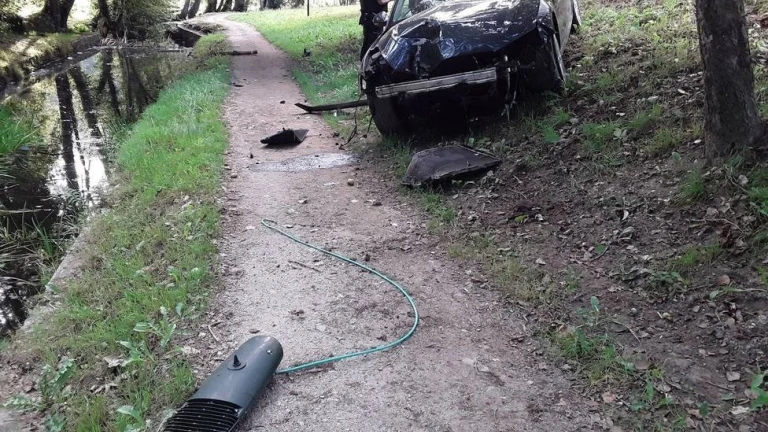 El coche que conducía el joven colisionó contra varios postes de madera y dos faroles del sistema de iluminación público