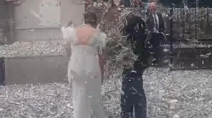 Los amigos de los novios hicieron acopio de 1500 kilos de papel, que trituraron durante la ceremonia, para lanzar a los recién casados tras salir de la iglesia