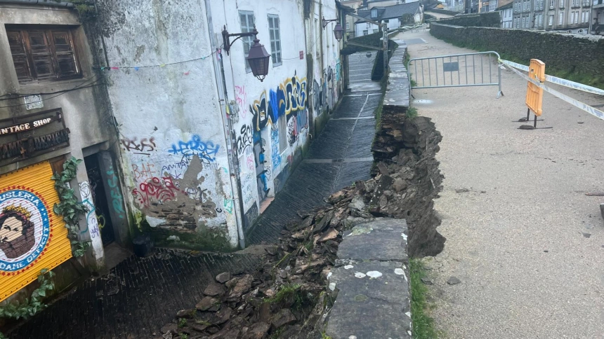 Un derrumbe en el corazón más olvidado de la ciudad. En la noche de ayer se produjo el desplome de un tramo del paramento interior de la Muralla Romana de Lugo en una zona degradada del casco histórico caracterizada por edificios en ruinas viviendas apuntaladas y un entorno urbano claramente descuidado El derrumbe tuvo lugar en la rúa do Moucho entre la Porta Miña y la Porta de Santiago en un área donde la muralla fue objeto de modificaciones históricas que alteraron su estructura original