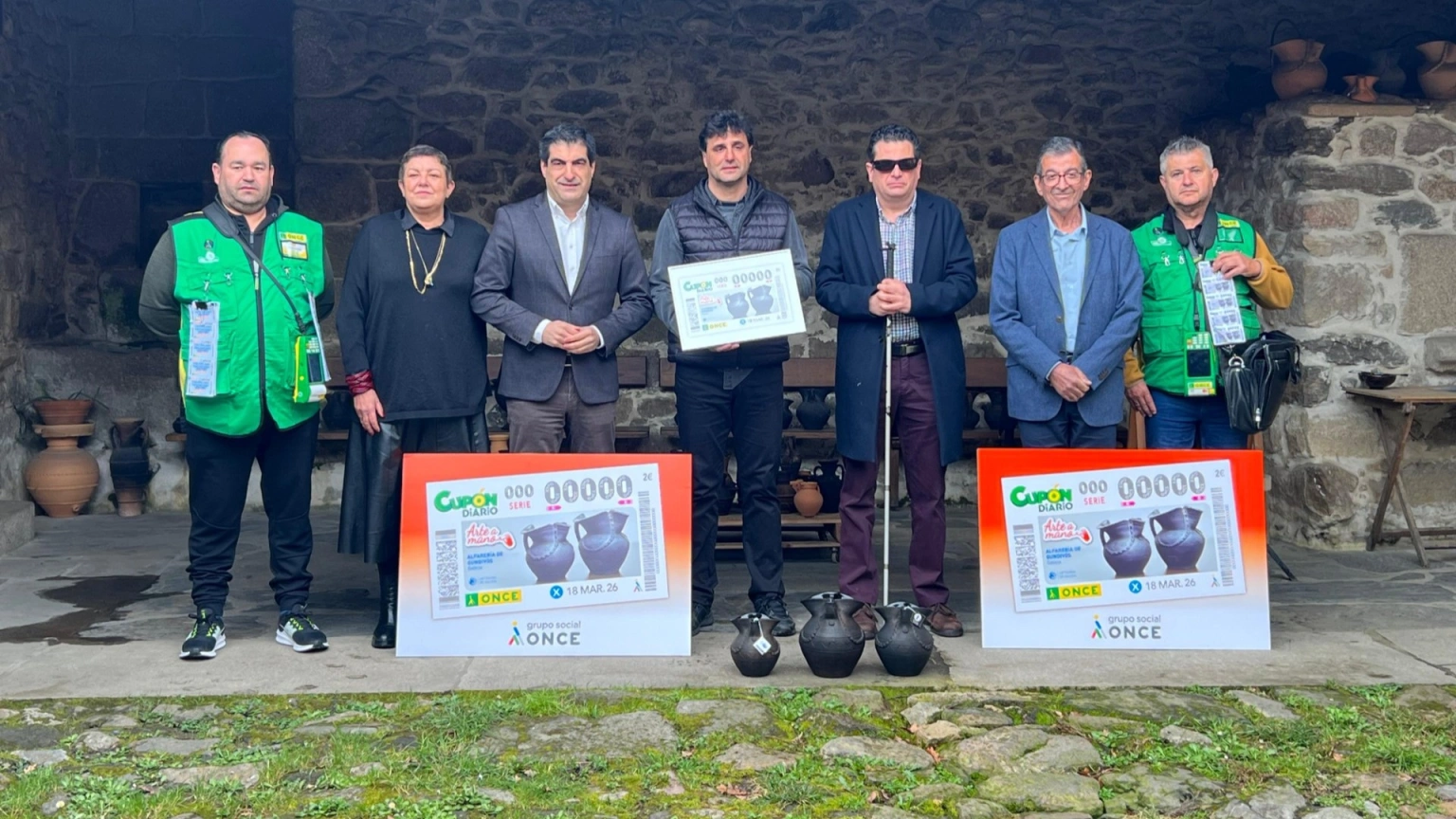 En la presentación del cupón participaron el director xeral de Comercio e Consumo, Gabriel Alén; la gerente de la Fundación Artesanía de Galicia, Elena Fabeiro; el director de la ONCE en Lugo, Francisco Javier Farnés; el alcalde de Sober, Luis Fernández Guitián, y el alfarero Elías González, del taller Rectoral de Gundivós y autor de la pieza.