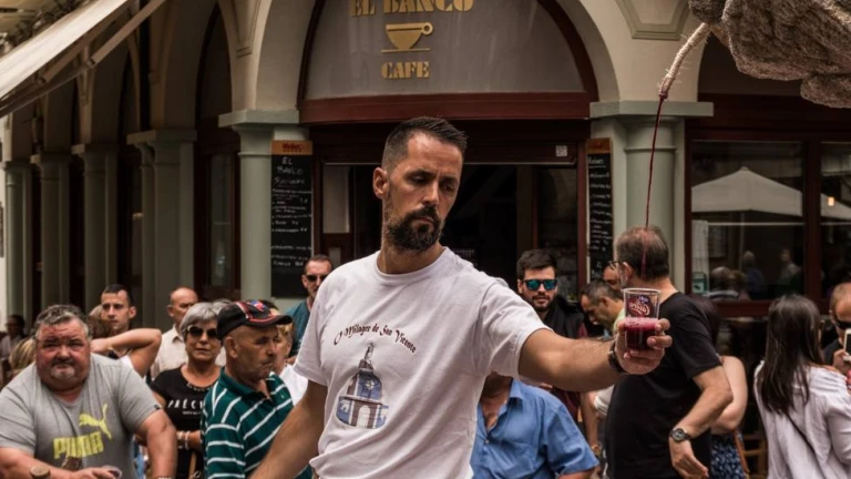 Los caños de la fuente dejan de echar agua y por ellos empieza a manar vino tinto