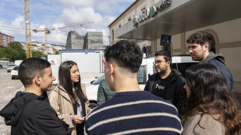 La popular Nicole Grueira, acompañada por otros miembros de Novas Xeracións, frente a la estación de tren de Lugo