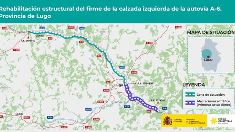 Estas obras que está ejecutando el Ministerio de Transportes y Movilidad Sostenible forman parte de la intervención programada para la rehabilitación estructural del firme de la calzada izquierda de la autovía A-6, entre los kilómetros 480 y 540,44 (entre los municipios de O Corgo y Guitiriz), en la provincia de Lugo.