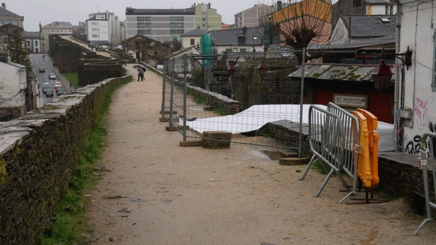 La Xunta de Galicia ha iniciado este lunes los trabajos de reconstrucción de un tramo de la Muralla romana de Lugo que se derrumbó el pasado sábado por la noche. Las intensas lluvias han provocado el desprendimiento a la altura de la Rúa do Moucho, donde ya han comenzado las tareas de desescombro y consolidación para garantizar la seguridad. El delegado territorial, Javier Arias, ha supervisado el inicio de las actuaciones.
