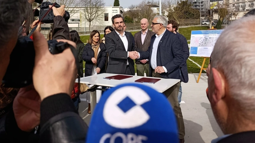 El conselleiro de Presidencia, Xustiza e Deportes, Diego Calvo, ha firmado este miércoles con el alcalde de Lugo, Miguel Fernández, el convenio de colaboración para la cesión del aparcamiento disuasorio impulsado por la Xunta en el entorno de la Avenida de Breogán. La administración autonómica ha invertido casi 1,2 millones de euros en esta infraestructura, que ofrecerá 148 nuevas plazas en el barrio de A Residencia. Con la firma, el Ayuntamiento asume la explotación, el mantenimiento y la conservación del recinto.