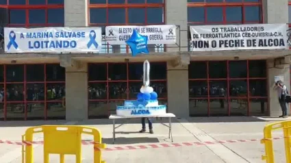 Durante la concentración, para recordar el año transcurrido desde que Alcoa presentó el ERE en la planta de aluminio, el comité reventó una tarta gigante de cumpleaños, al tiempo que se escuchaban consignas como "Madrid escoita, A Mariña está en loita", "Se non hai solución, Goberno dimisión", "Sen industria, non hai futuro", "Fóra ianquis, pandilla de mangantes", "Queremos traballar e non emigrar" o "Sepi, escoita, A Mariña está en loita".