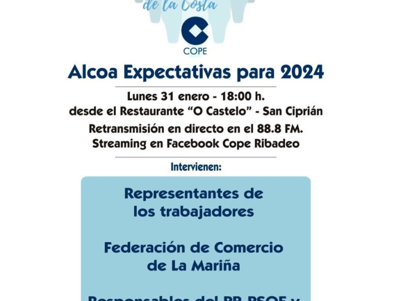 Este lunes 31 de enero a partir de las 18 hrs en directo por COPE DE LA COSTA, 88.8 FM, y en streaming por Facebook Cope de la Costa. El futuro de Alcoa, sobre la mesa.