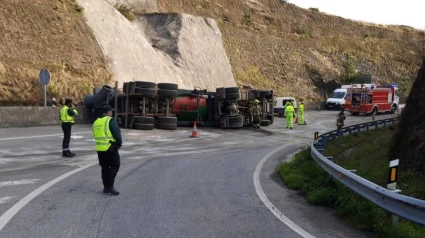 Camión hormigonera volcado en la N-624, punto kilométrico 582