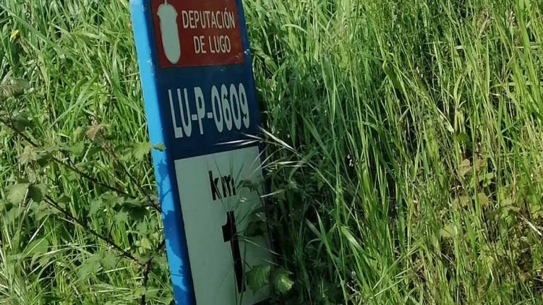 Señal de kilometración de la LU-P-0609 semioculta por la maleza