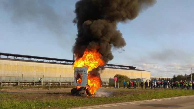 En pocos minutos, el cartel con el logotipo de Alcoa Europe, situado en la entrada al complejo industrial, tanto a la refinería de alúmina como a la planta de aluminio primario, fue devorado por las llamas, ante la atenta mirada de los manifestantes, todos vestidos con su ropa de trabajo.