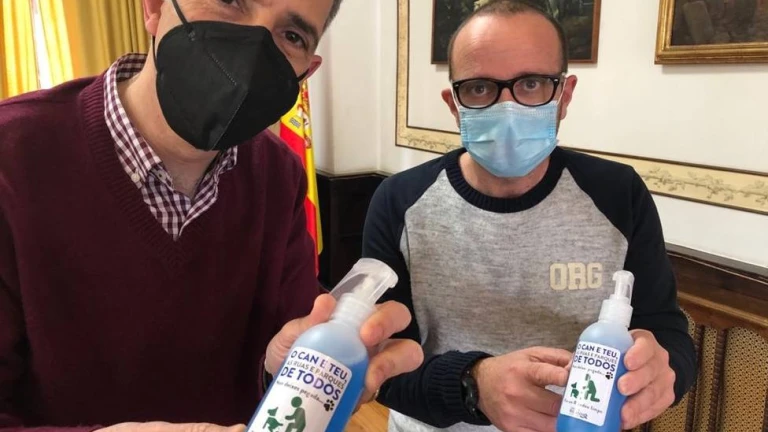 Los botes de desinfectante llevan una pegatina en la que se puede leer el mensaje: "O can é teu, as rúas e os parques de todos".