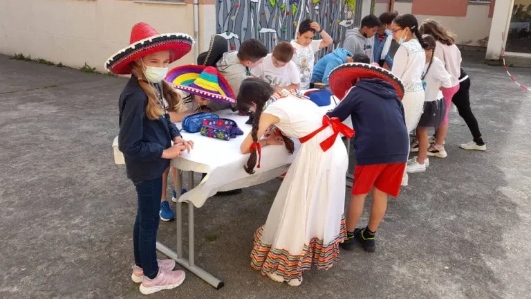 El profesorado del colegio focense ideó una "fiesta gallego-mexicana" para acercar el alumnado a la trayectoria vital del escritor homenajeado este año, figura destacada del exilio galleguista en México, y les mostró a los niños y niñas, a partir de sus Poemas mexicanos, distintas danzas del mundo.